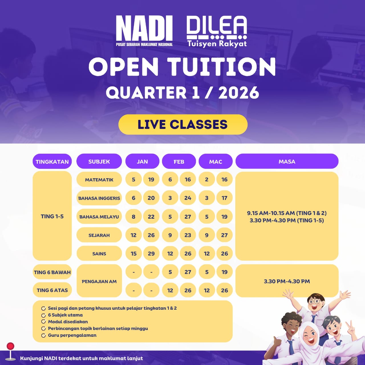 Assalamualaikum warahmatullahi wabarakatuh dan salam sejahtera, Merujuk kepada perkara di atas, sukacita dimaklumkan bahawa Pendaftaran Guidance Tuition Fasa Kedua bagi pelajar Tingkatan 4 dan Tingkatan 5 untuk sesi tahun 2026 kini dibuka. Pendaftaran ini akan ditutup pada 31 Januari 2026 (Ahad). Pihak NADI […]