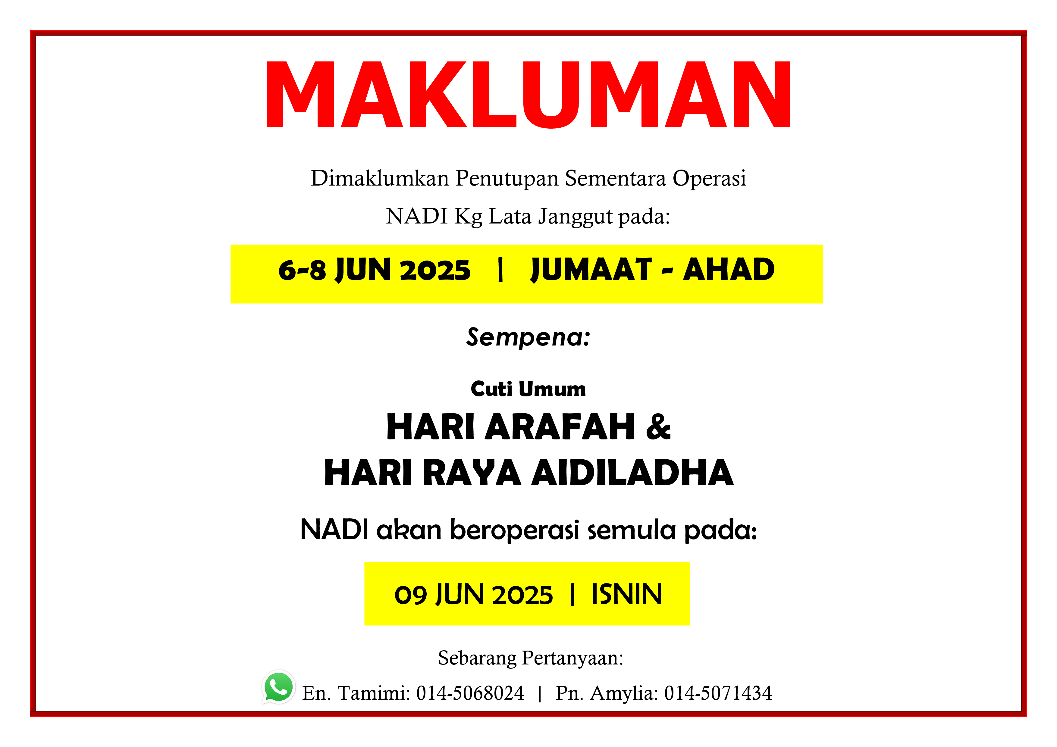 MAKLUMAN PENUTUPAN SEMENTARA OPERASI NADI SEMPENA HARI ARAFAH DAN SAMBUTAN AIDILADHA