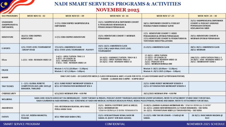 Sebarang program,kelas dan aktiviti yang dijalankan di NADI pada bulan tersebut boleh rujuk pada jadual yang telah disediakan.