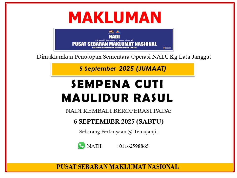 ASSALAMUALAIKUM WBT…Makluman penutupan sementara operasi NADI sempena cuti MAULIDUR RASUL.. Sekian,terima kasih..