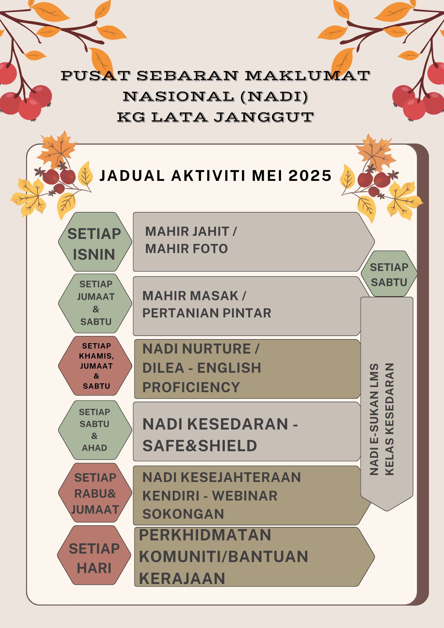 Sebarang program,kelas dan aktiviti yang dijalankan di NADI pada bulan tersebut boleh rujuk pada jadual yang telah disediakan.